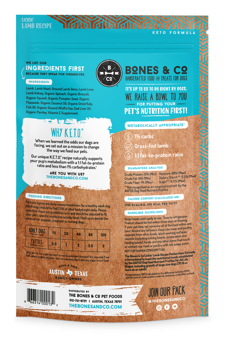 INGREDIENTS: Lamb, Lamb Heart, Ground Lamb Bone, Lamb Liver, Lamb Kidney, Organic Spinach, Organic Broccoli, Organic Squash, Organic Pumpkin Seed, Organic Flax Seed, Organic Coconut Oil, Organic Dried Kelp, Krill Oil, Organic Alfalfa, Cod Liver Oil, Organic Parsley, Vitamin E Supplement.