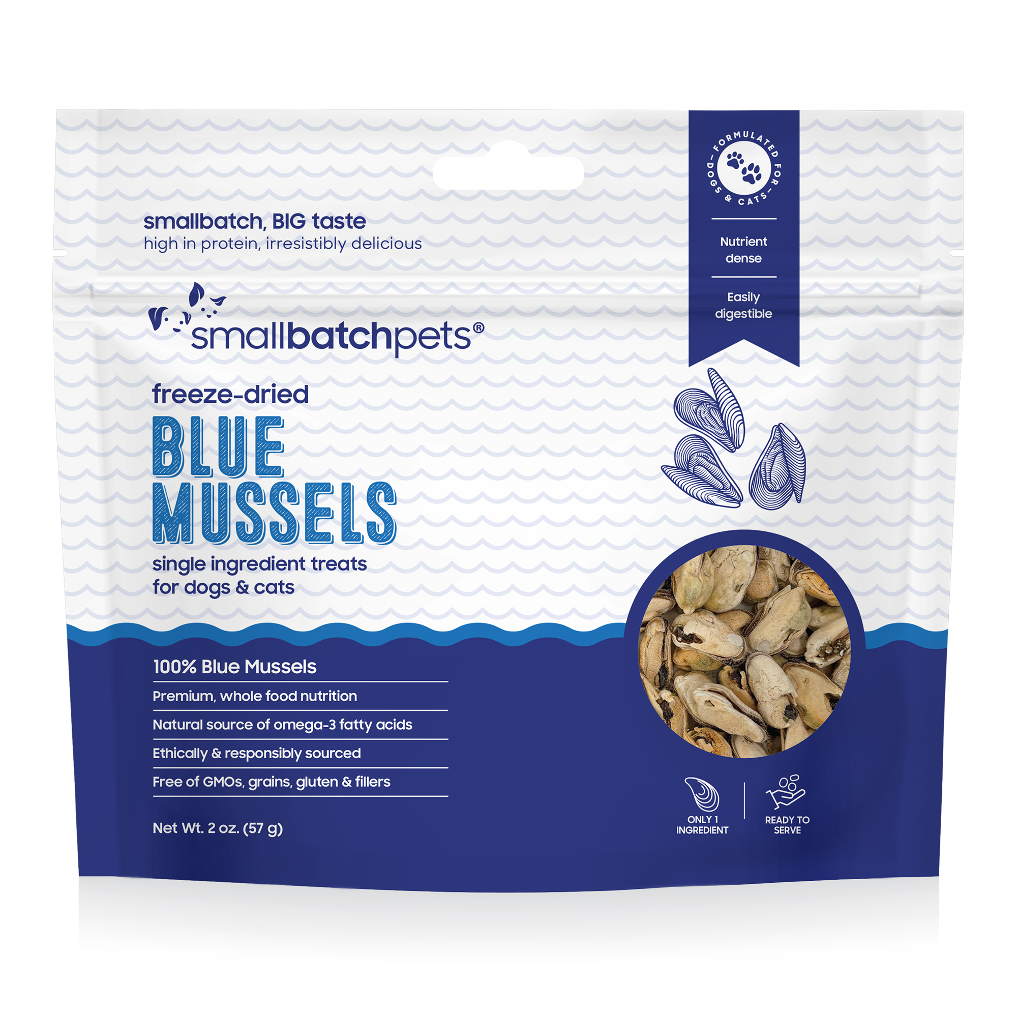 Smallbatch Freeze-Dried Blue Mussels are sustainably harvested and gently freeze-dried to retain their powerful nutrient profile. Naturally rich in DHA, EPA, vitamin B12, and essential minerals, blue mussels support joint mobility, skin health, and immune function. Smaller in size and easy to feed, these single-ingredient treats contain no synthetics or fillers and are ideal for dogs and cats.